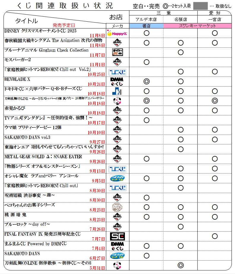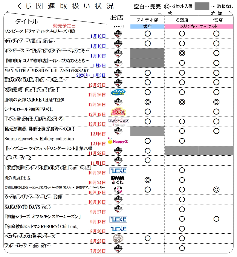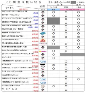 クジの残り枚数や景品の残りについては変動するため掲載しておりません